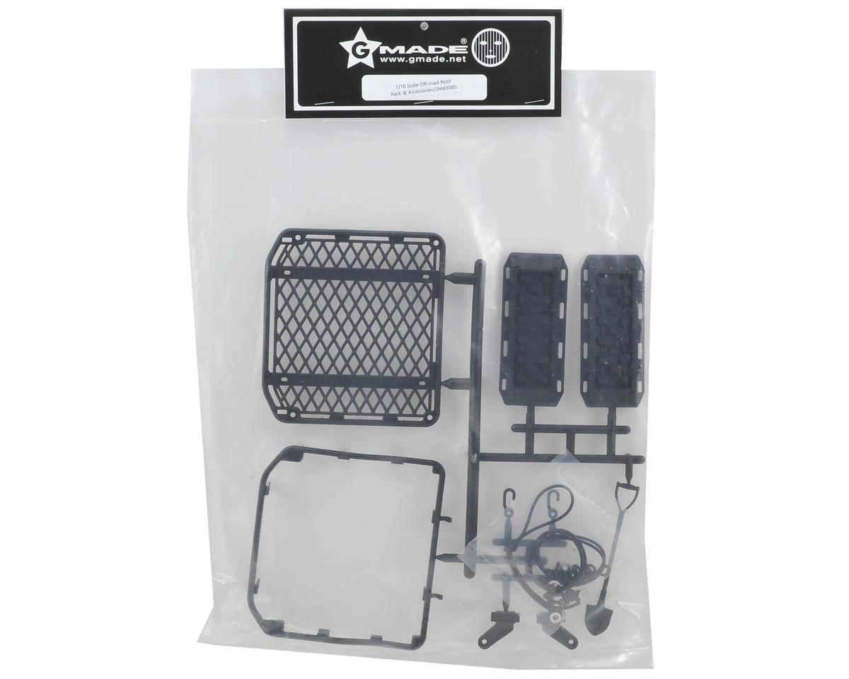 Gmade 1/10 Scale Off-Road Roof Rack Set. This parts tree includes the roof rack and accessories included with the Gmade Komodo Body.