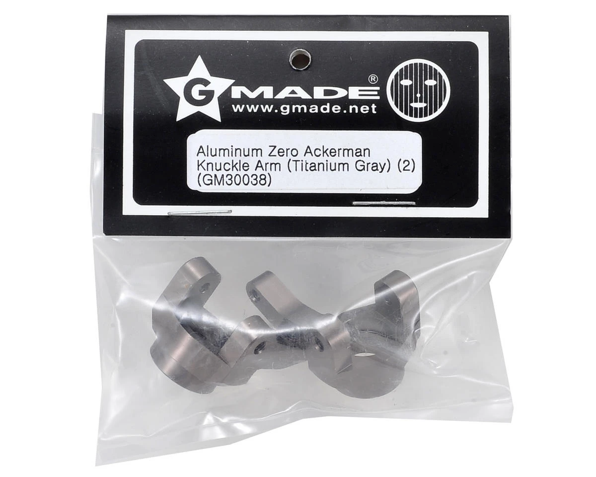 Gmade Aluminum Zero Ackerman Knuckle Arm. Compared to the stock knuckles, these optional aluminum zero ackerman knuckles increase the steering angles to provide a tighter turning radius. The one piece heavy duty design is precision machined for a perfect fit and is a must have performance/durability upgrade for your Komodo or Sawback rig.