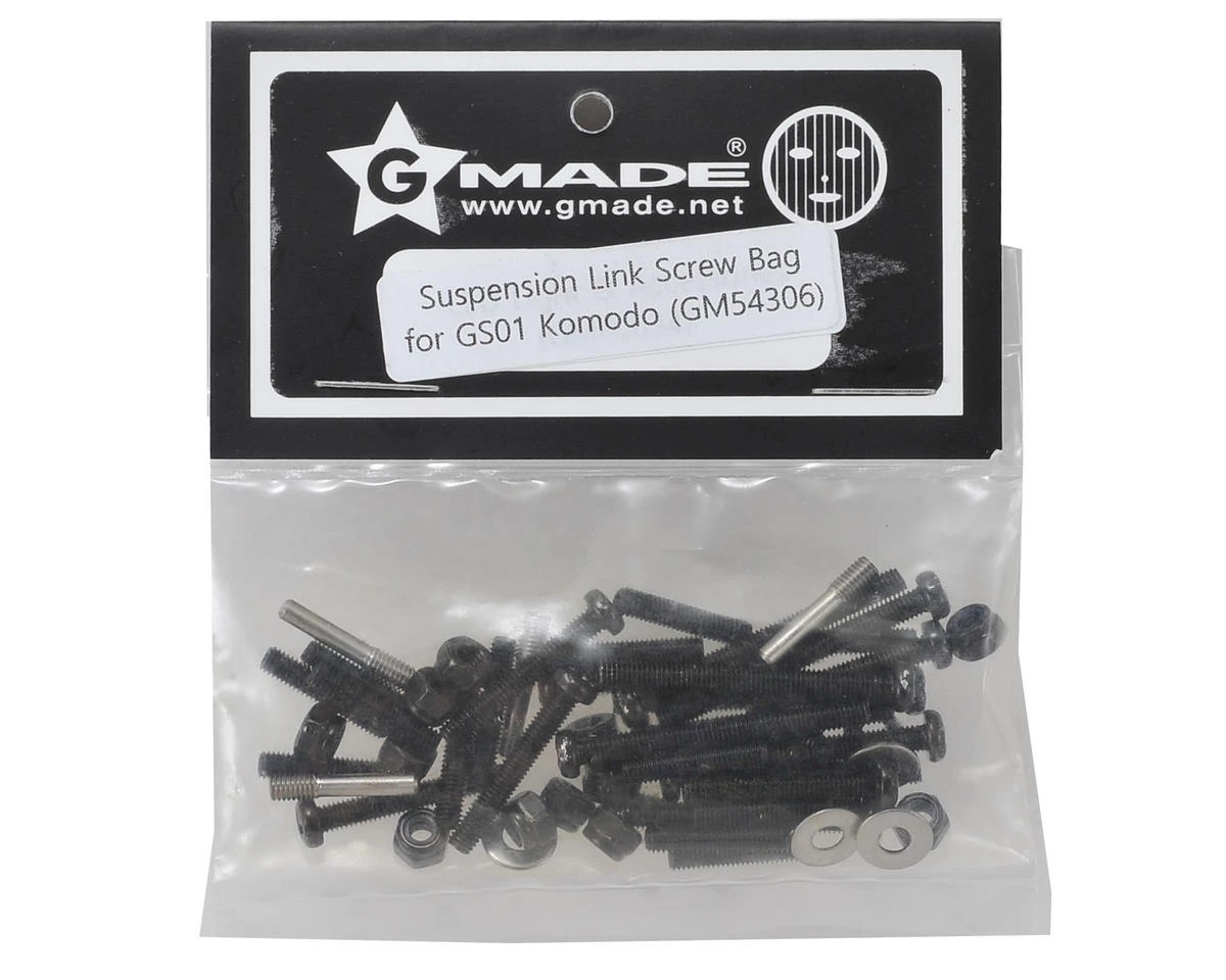 Gmade Komodo Suspension Link Screw Bag. Package includes the screws, screw pins, nuts and washers used in the suspension links.