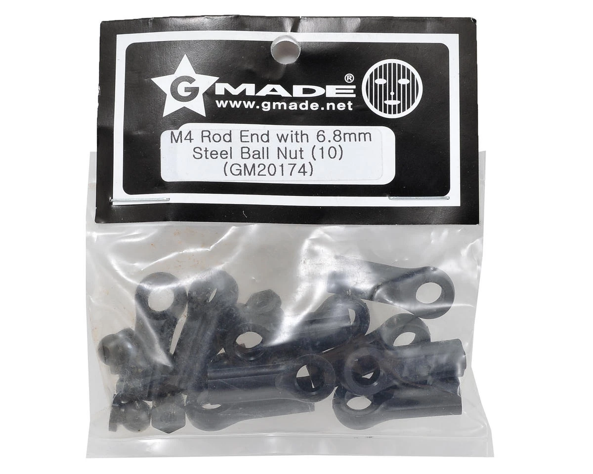 This is a pack of ten replacement Gmade M4 Rod Ends, with ten 6.8mm Steel Ball Nuts and is intended for use with the Gmade R1 Rock Buggy.