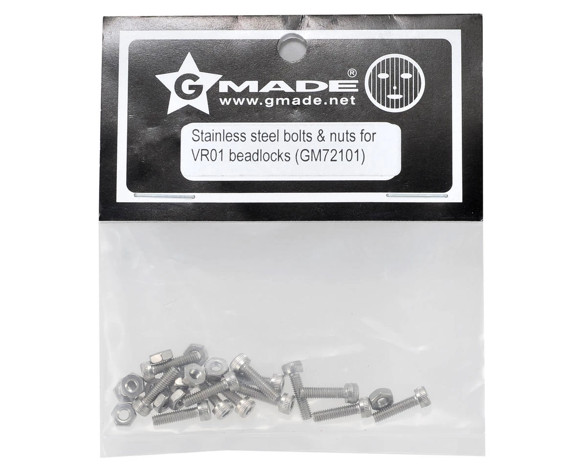 This is a replacement Gmade Stainless Steel VR01 Beadlock Hex Bolt & Nut Set. Package includes twelve 2.5x10mm stainless steel bolts, and twelve M2.5 stainless steel nuts.