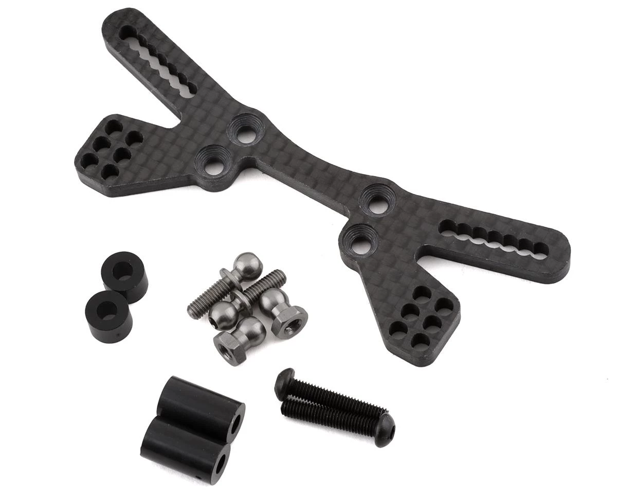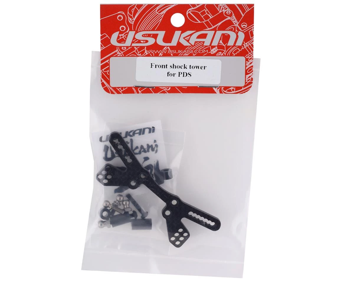 This is a replacement Usukani Front Shock Tower, suited for use with the Usukani PDS drift car. Includes button head mounting screws, ball studs, ball stud nuts, and ball stud spacers.