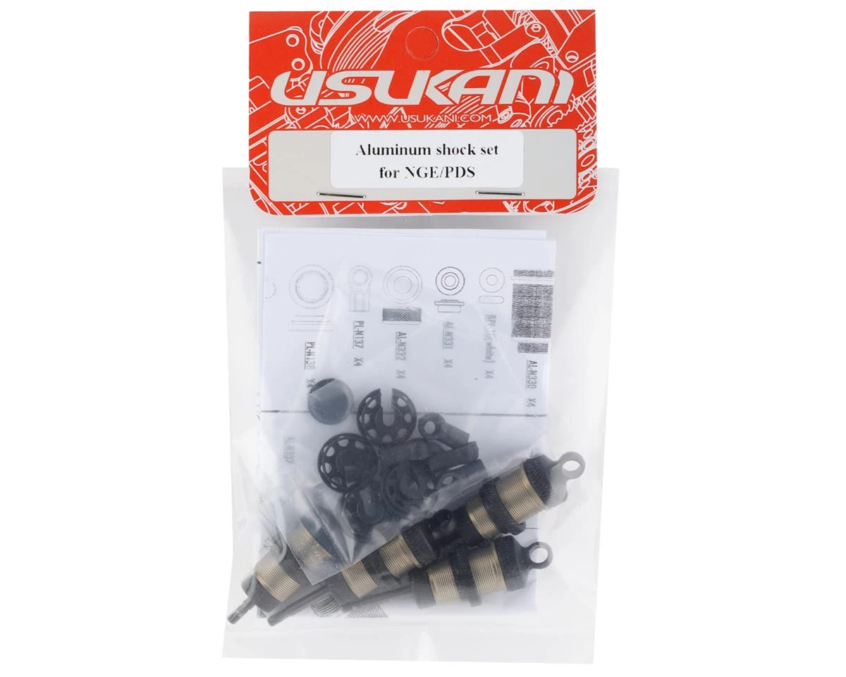 Usukani NGE/PDS Aluminum Shock Set. These replacement shocks are intended for the Usukani NGE or PDS. Package includes four shock assemblies, four spring cups, for shock ends eight O-rings and four shock bladders.